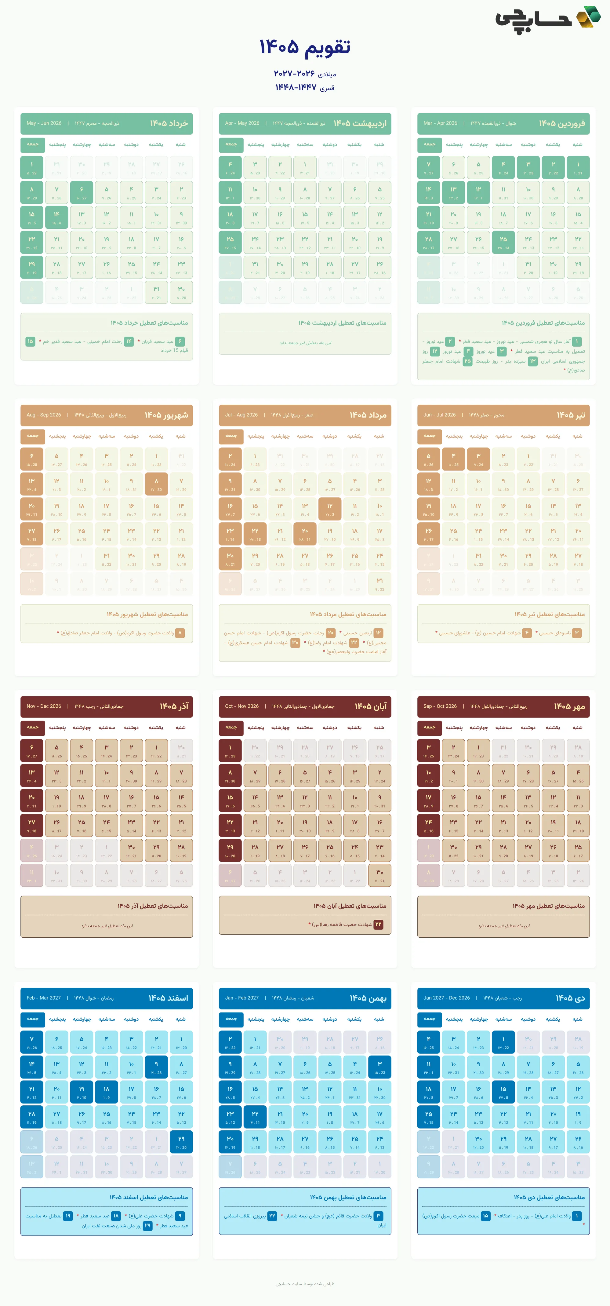 تقویم آنلاین سایت حسابچی بر پایه تقویم رسمی جمهوری اسلامی ایران طراحی شده و شامل تقویم هجری شمسی، میلادی و قمری همراه با روزهای هفته، مناسبتهای ملی، مذهبی و جهانی، و تعطیلات رسمی سالهای ۱۳۸۱ تا ۱۴۰۴ میباشد. در صفحه تقویم حسابچی میتوانید تقویم هر ماه و سال را مشاهده کنید. همچنین بخش تاریخ امروز تاریخ دقیق امروز ایران را با تمام مناسبتها و تعطیلات رسمی کشور بهصورت خودکار نمایش میدهد. همچنین میتوانید از ابزار تبدیل تاریخ برای تبدیل تاریخ شمسی، میلادی و هجری استفاده کنید.